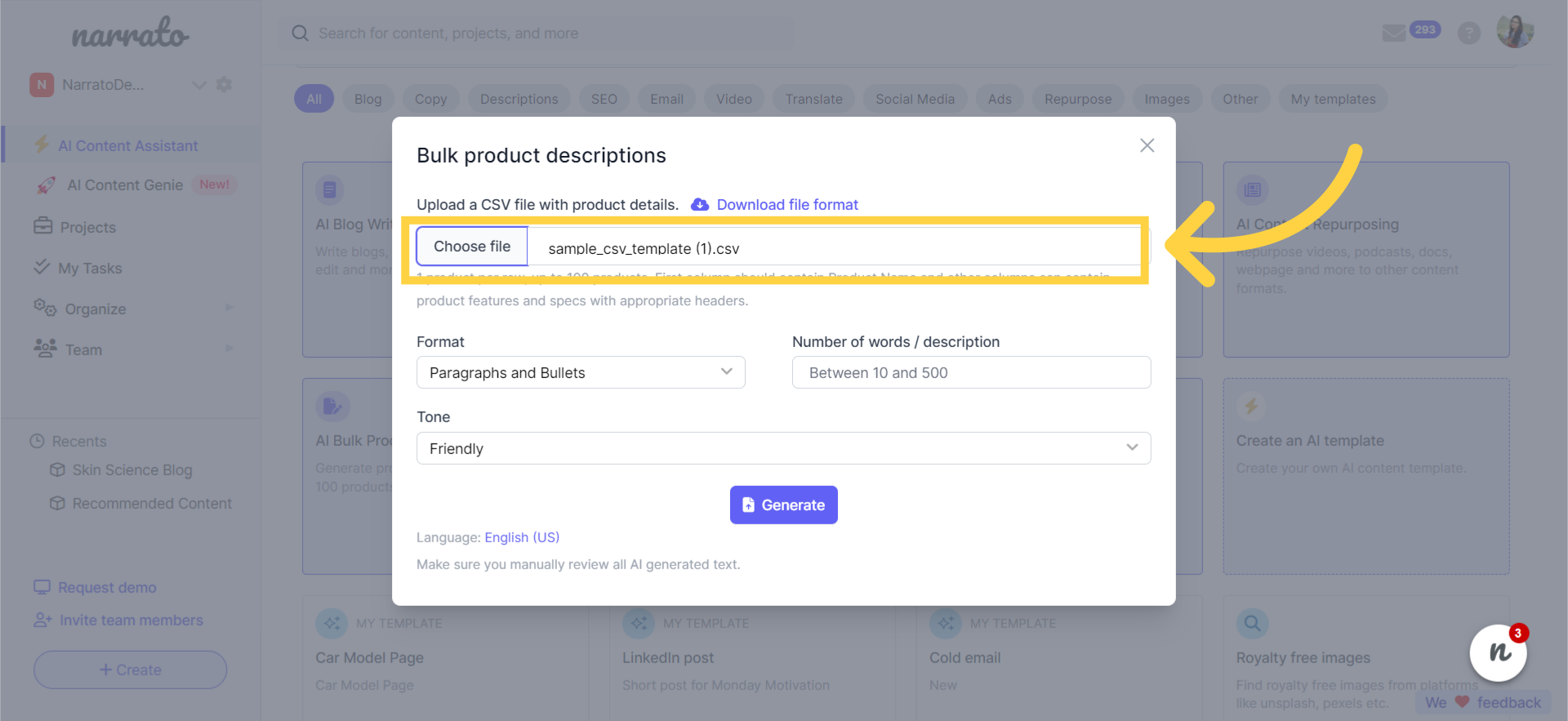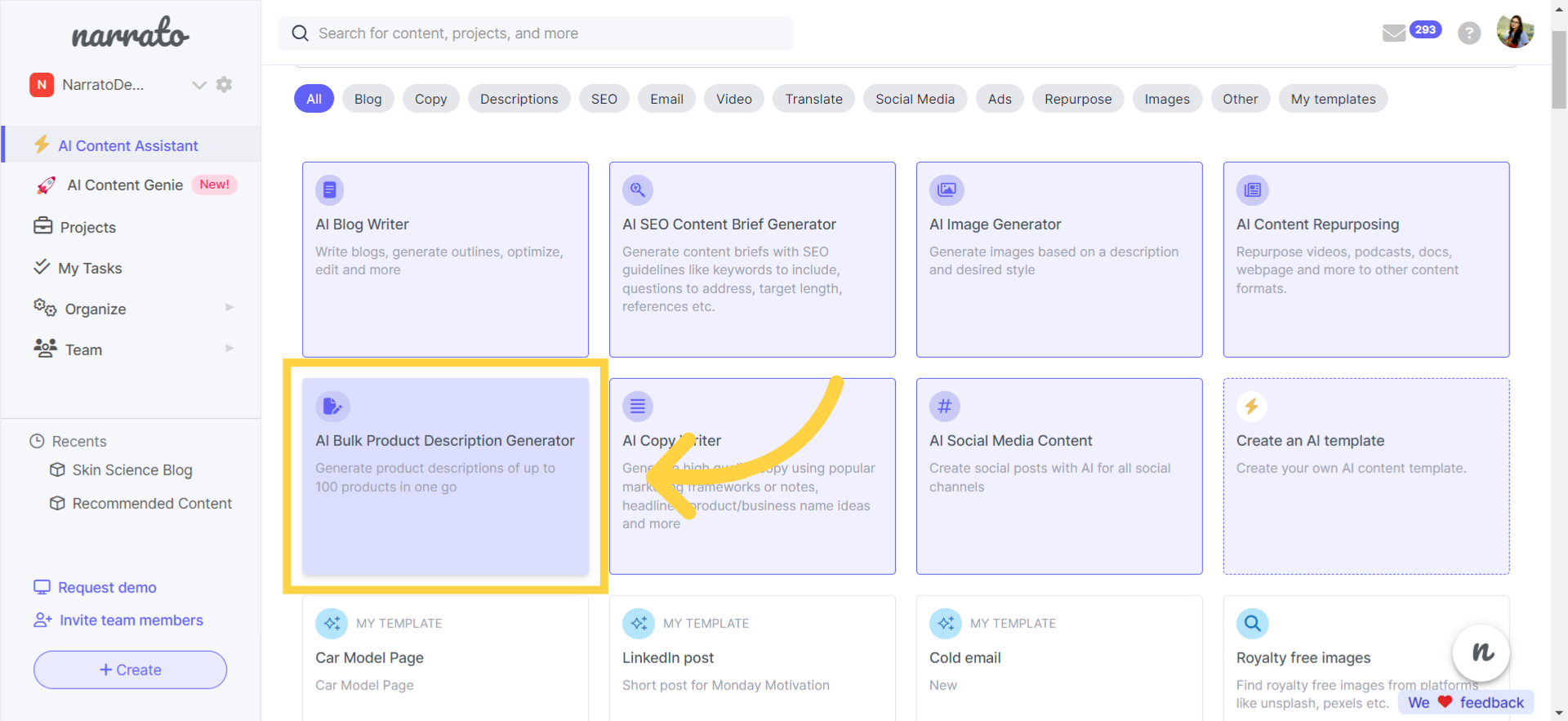 1. To create product descriptions in bulk, go to the AI Content Assistant, and click on the AI Bulk Product Description Generator template