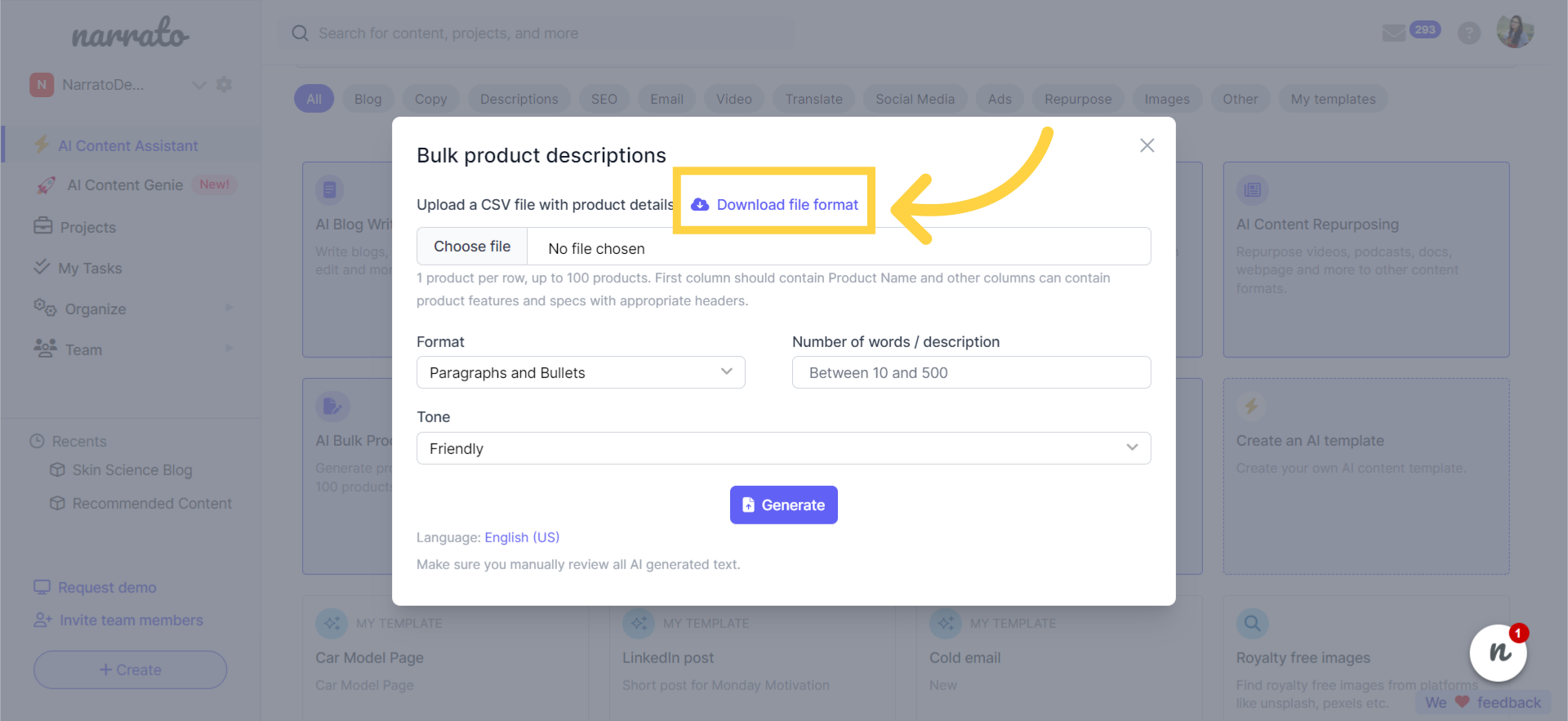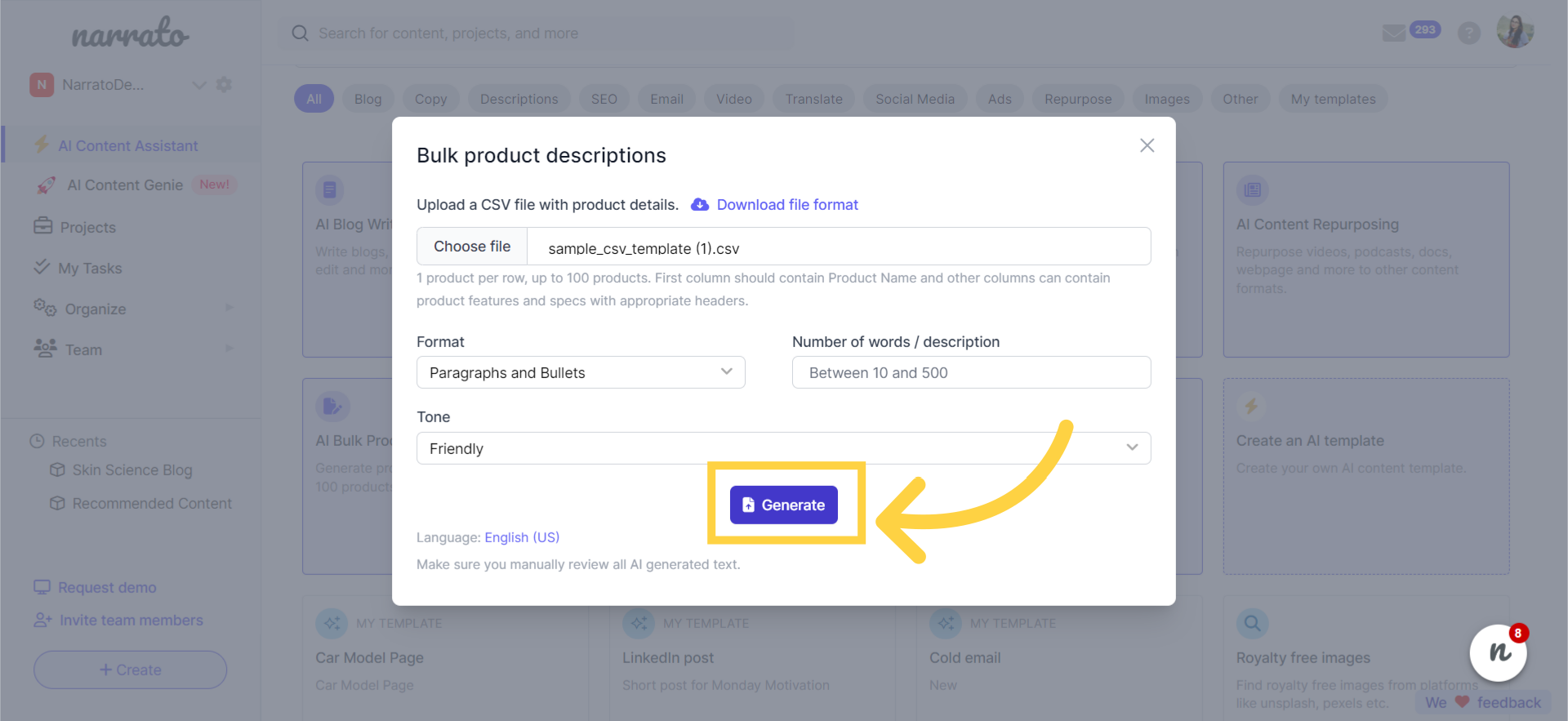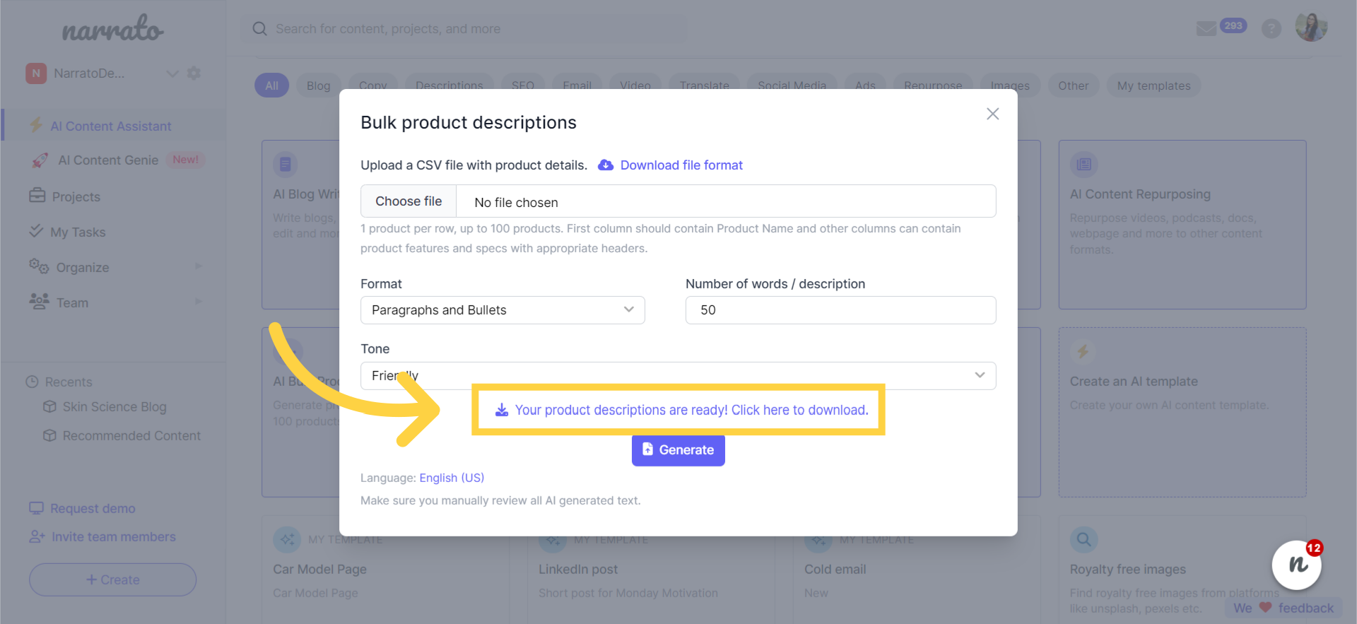 7. You can generate up to a hundred product descriptions in one go and download output as a CSV. If you need to generate a larger number of product descriptions, get in touch with us for custom plans.
