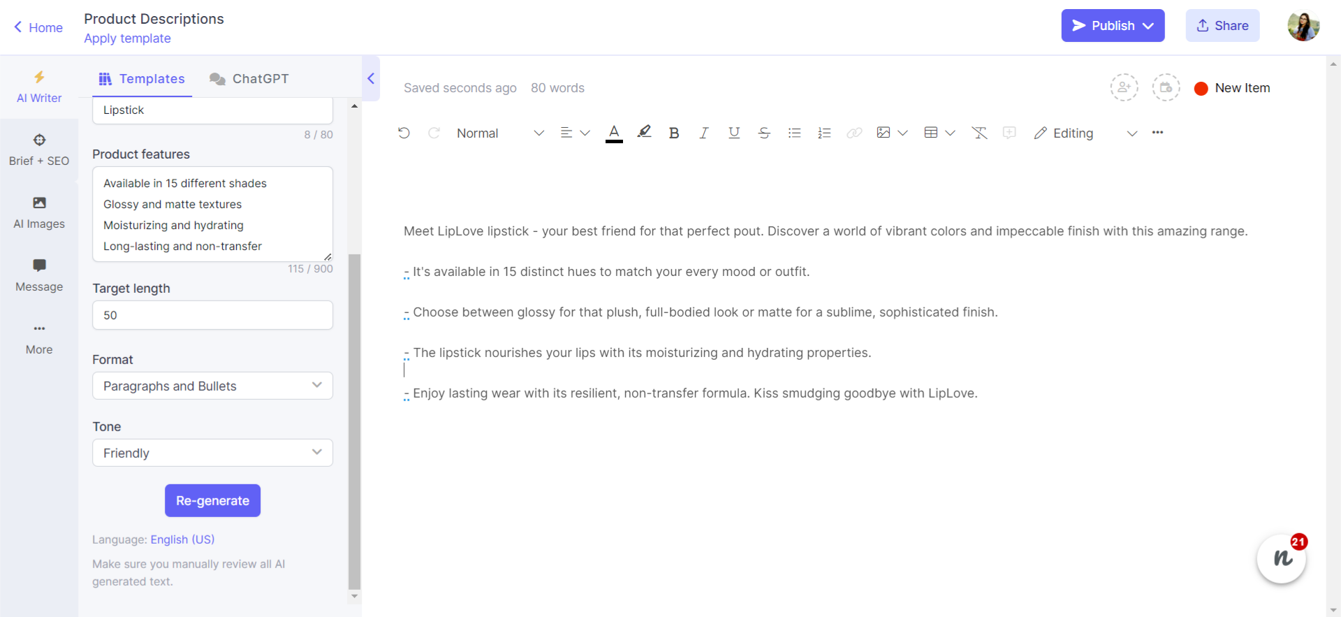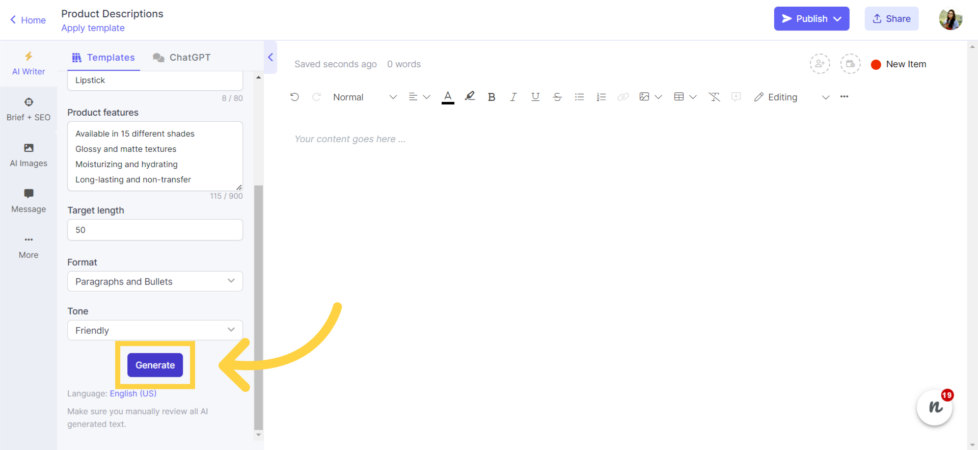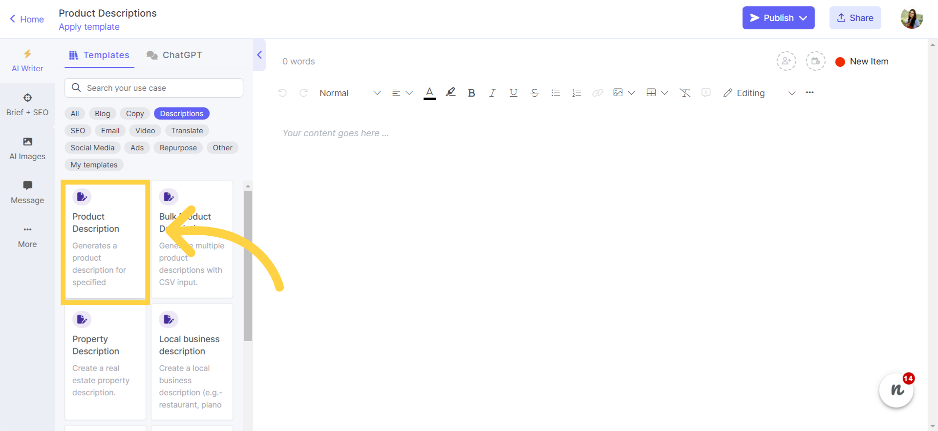 1. To use the single product description generator, go to the AI writer on the content task page and click on the Descriptions category pill under Templates