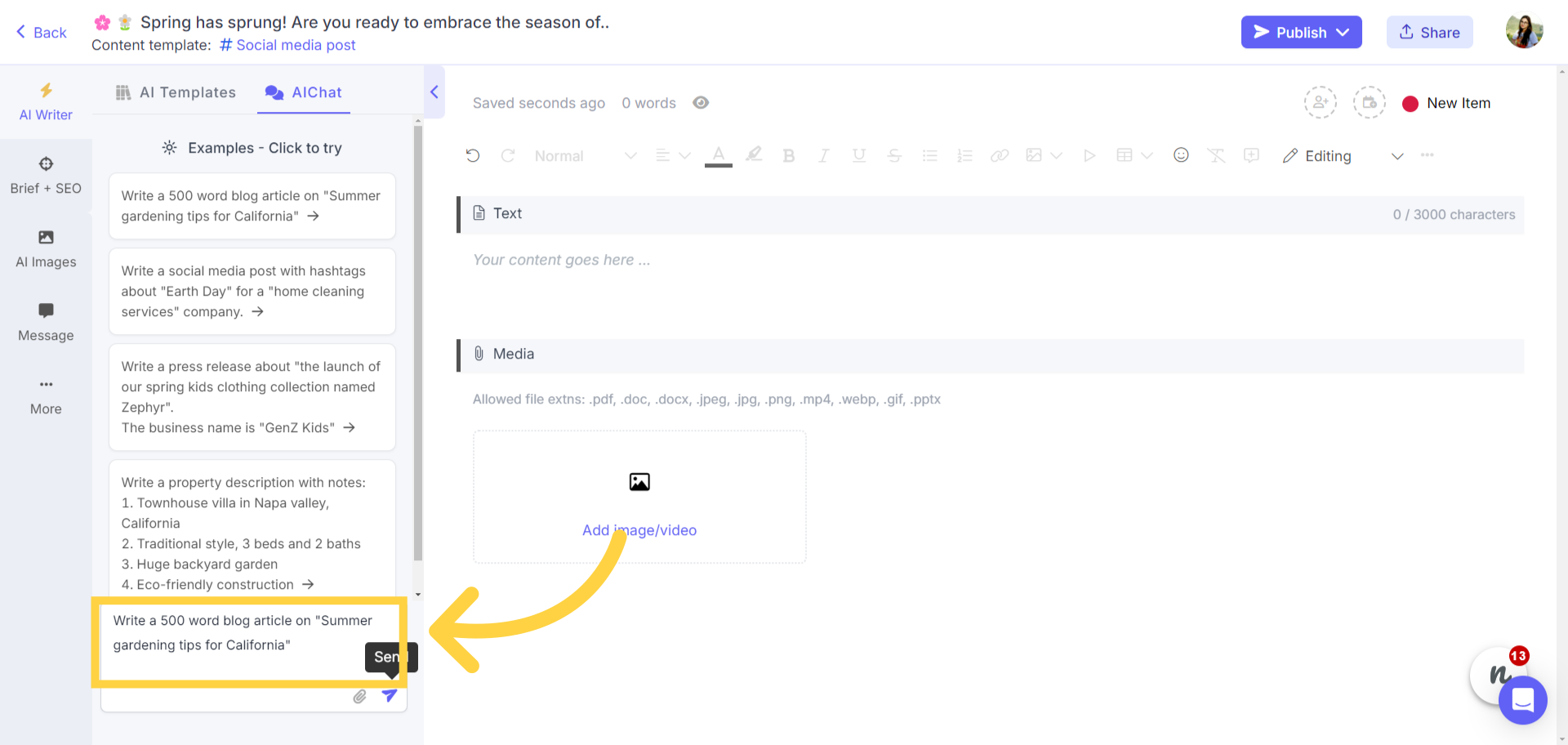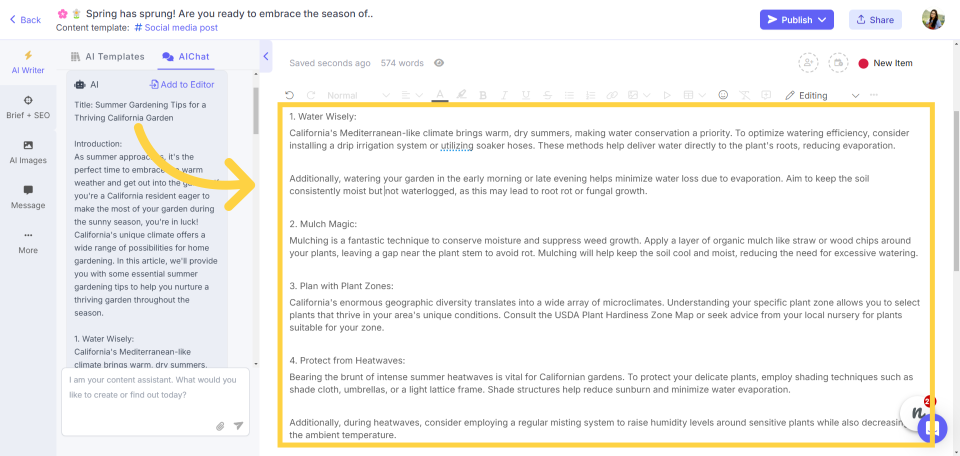Click on the AI writer option and select one of the pre-built options to enhance selected content